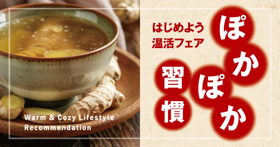 体を内側からじんわり温める“温活”をテーマにした「ぽかぽか習慣フェア」を開催します。生姜を使ったドリンクやスープ、旨辛メニューなど、食べてぽかぽか・飲んでぽかぽかな商品を豊富にご用意。さらに、湯豆腐やおでんなどの定番あったかメニュー、入浴タイムを楽しむ温浴雑貨まで、暮らしの中で無理なく“温活”を取り入れられるラインアップを揃えました。